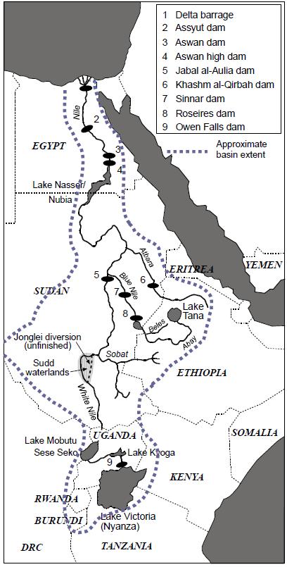 Plusieurs barrages et réservoirs ont été construits ces dernières années et plusieurs autres sont en chantier : le haut barrage d’Assouan (1970), le barrage de Sennar, le barrage de Roseires (1965) et celui de Méroé, pour n’en citer que quelques-uns. Les habitants de ces régions se battent désespérément pour maintenir le débit existant du Nil tout au long de son cours, alors même que ce processus connaît fatalement des limites.