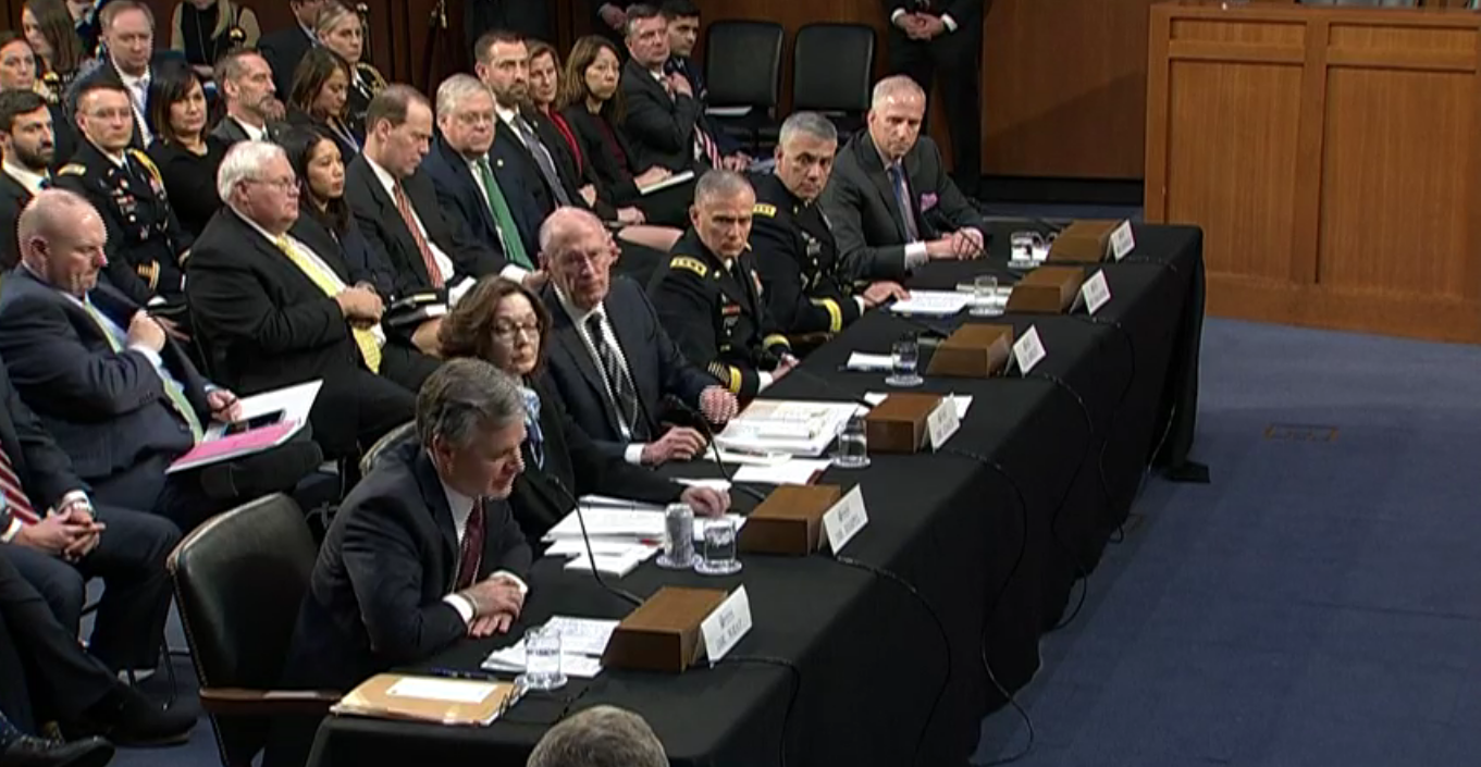 Lors d’une séance publique de la Commission sur le Renseignement du Sénat, les dirigeants des différents services de renseignement – Dan Coats de la National Intelligence Agency (NIA), Gina Haspel de la CIA ou encore Christopher Wray du FBI – ont présenté leur « Évaluation des menaces, à l’échelle mondiale », se trouvant presque en tous points en contradiction avec la politique étrangère du président Trump.