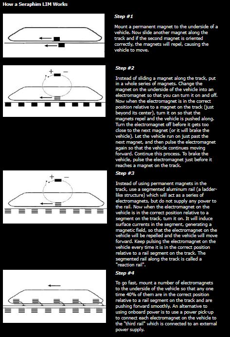 - (1b) Tout en gardant un train sur roues, on peut le faire avancer en installant un SERAPHIM. Dans ce cas, c’est un moteur à induction linéaire, qui, agissant par induction électromagnétique sur un rail de réaction, fait avancer le véhicule, tandis que les roues ne servent plus qu’au guidage. Des électroaimants, installés en selle de cheval au-dessus d’une plaque métallique au centre de la voie, génèrent un champ magnétique qui, en interaction avec ce « rail à réaction », font avancer le train. Dans les années 1970, des prototypes pour cette option furent testés, avec un succès limité, au centre d’essai du chemin de fer américain de Pueblo, au Colorado. Cependant, à ce jour, des douzaines de systèmes de transport urbain utilisent des LIMs dans cette configuration, notamment le système Advanced Rapid Transit (ART) de Vancouver, construit par Bombardier, ou encore le monorail de Moscou, car cette technologie s’avère bien plus efficace pour affronter des conditions climatiques extrêmes. Aux Etats-Unis, cette innovation a été baptisée « Maglift », car le SERAPHIM fait également appel à un peu de lévitation magnétique, et peut ainsi bénéficier du budget alloué au Maglev par le ministère du Transport, bien que dans ce modèle, il s’agisse toujours de roues métalliques et de rails en acier. Néanmoins, le SERAPHIM développé par Sandia fut proposé par la Meneren Corporation pour construire des trains Maglift à grande vitesse pour les grands couloirs ferroviaires américains. Notons ici que, étant donné le sous-équipement des Etats-Unis en matière de réseau électrique, Sandia et Meneren ont proposé un modèle utilisant du diesel ou du kérosène pour alimenter le moteur électrique linéaire...