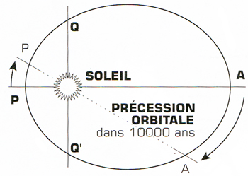 Si on le corrige pour tenir compte d’un autre phénomène, dit « l’avance du périhélie », cela signifie qu’à peu près tous les 21000 ans, l’inclinaison de l’axe terrestre est tel que dans l’hémisphère nord « l’été » intervient lorsque la Terre se trouve au point le plus éloigné du Soleil.
