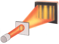 Un faisceau de lumière passant à travers deux fines fentes percées dans une paroi produira aussi de telles franges d’interférence sur un écran. C’est pourquoi on émit l’hypothèse que la lumière devait avoir les mêmes caractéristiques ondulatoires que les vagues sur l’eau. Après quoi vint la question : sur quoi la lumière ondule-t-elle ?