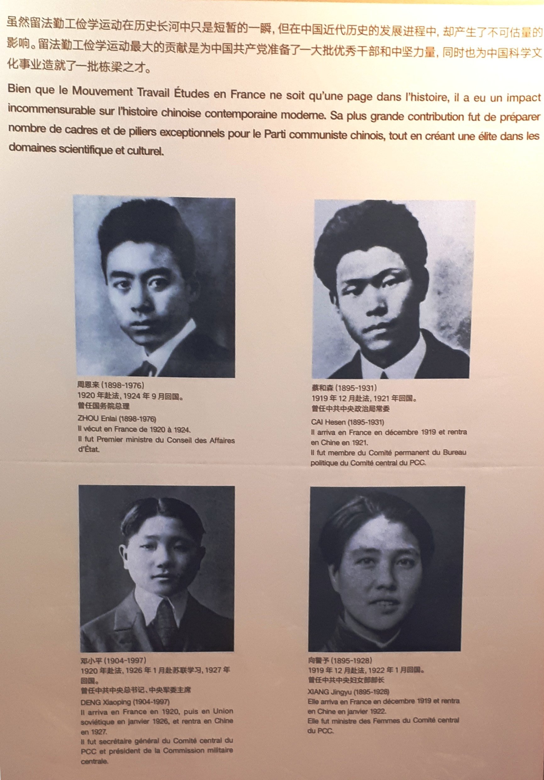 Ces deux événements sont intimement liés, car c’est pour libérer et moderniser la Chine, dépecée par les puissances occidentales profitant de la décadence de la dynastie Qing, que ces étudiants furent envoyés en France pour apprendre le meilleur de la culture occidentale. Parmi eux, Deng Xiaoping, Zhou Enlai et Chen Yi, qui ont fait partie du noyau d’hommes qui allaient faire de la Chine, cent ans plus tard, la puissance qu’elle est devenue aujourd’hui. (Voir images ci-contre) Beaucoup d’autres y ont contribué aussi, politiquement, dans les sciences et dans les arts (voir ci-contre encre de Xu Beihong).