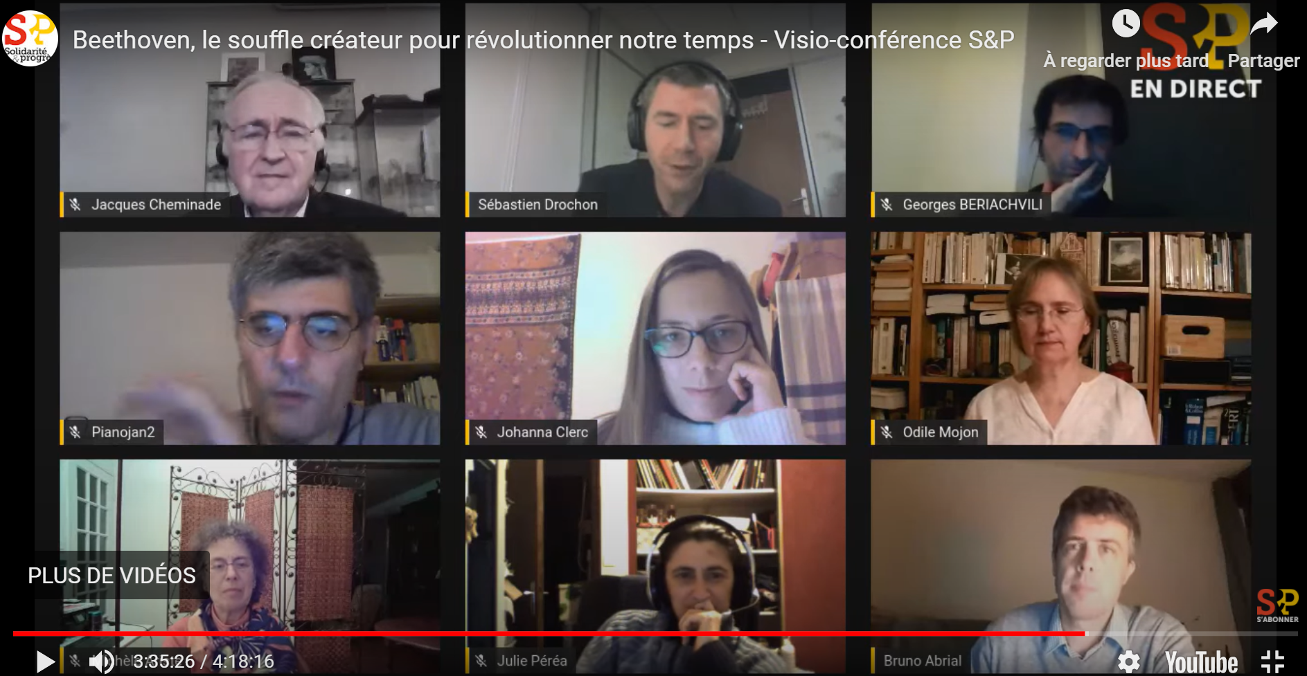 L’audience de notre visioconférence n’était pas en reste, car elle posait la question légitime de comment transmettre la compréhension de Beethoven à tous. Or, une résistance est déjà en place : dans le monde associatif basé sur des initiatives privées, la musique de Beethoven est timidement transmise à une population de plus en plus vieillissante. Mais les institutions officielles sont largement démissionnaires. Aujourd’hui, les musiciens, les compositeurs et les militants associatifs ne peuvent pas compter sur un État qui préfère promouvoir une culture officielle « démocratique » plutôt qu’accompagner sa population avec une culture de la vie et la découverte, par peur des « mauvaises idées » que ça pourrait lui donner.
