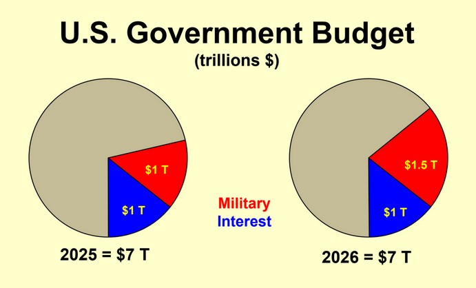 Ces chiffres ne sont pas rigoureusement exacts mais donnent un ordre de grandeur. En 2025, le budget total du gouvernement américain s’élevait à environ 7000 milliards de dollars, dont 14 % (1000 milliards) consacrés au paiement des intérêts de la dette publique. Une autre enveloppe de 1000 milliards de dollars était allouée au budget militaire.