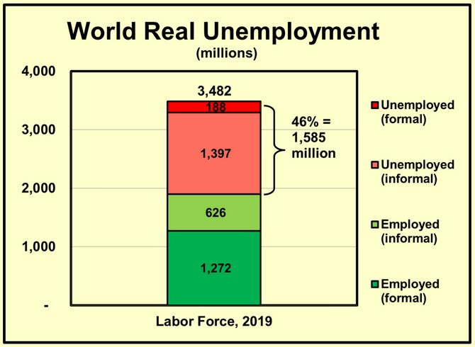 Mais la question cruciale est la suivante : nous devons accroître l’emploi productif de la population mondiale. Le graphique ci-dessus est issu d’une étude que nous avons menée il y a quelques années. Nous avons examiné l’état de la force de travail à l’échelle mondiale, soit environ 3,5 milliards de personnes actives, en nous intéressant à la part de celle-ci qui était officiellement au chômage, mais aussi à celle de facto au chômage, c’est-à-dire les personnes travaillant dans l’économie informelle, avant tout non productives. Par exemple, les enfants qui vendent du chewing-gum dans les rues des pays du Sud, ou les personnes qui, pour survivre, sont contraintes de se livrer à toutes sortes d’activités, mais non productives. Nous avons ainsi déterminé que le taux de chômage réel mondial avoisinait les 46 %, soit environ 1,5 milliard de personnes qui ont besoin de retrouver un emploi productif.