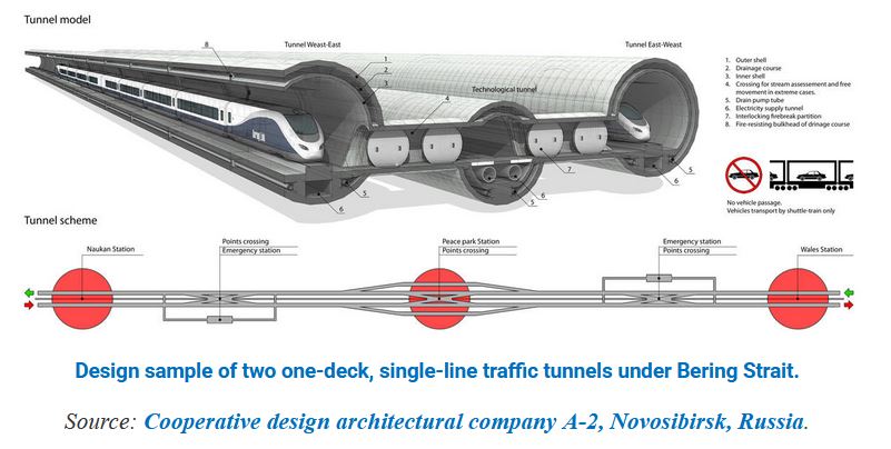 - une ligne principale à grande vitesse et à double voie, entièrement électrifiée, d’une longueur totale de 6000 km : 103 km de tunnel multimodal, y compris 8 km sur terre ferme de chaque côté, 2844 km de chemin de fer du côté américain pour rejoindre Fort Nelson au Canada et 3850 km de chemin de fer du côté russe pour relier Uelen à Egvekinot, Zyrianka, Ust-Nera et Yakoutsk ;