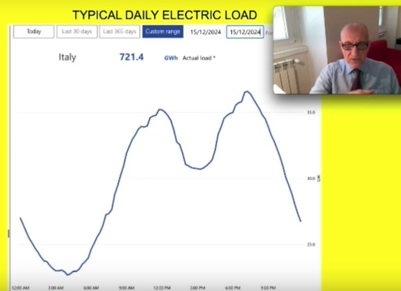 Rien ne changera à cela. Pourquoi ? Parce que, dans chaque pays, le pic de demande d’électricité se situe vers 18 ou 19 heures chaque jour. C’est ce que montre la courbe cruciale représentant la charge électrique quotidienne. C’est une courbe identique pour tous les pays du monde et tous les jours de l’année. J’ai naturellement choisi la courbe de l’Italie, et comme jour de l’année, j’ai choisi le jour le plus important de l’univers : mon anniversaire.