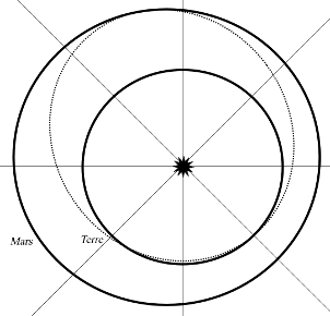 L’orbite de transfert de Hohmann reprend sa forme classique lorsqu’il s’agit de se rendre de la Terre à Mars (figure 3). Sauf qu’elle n’est pas tout-à-fait tangentielle aux orbites des deux planètes car ces dernières ne sont pas circulaires mais elliptiques. C’est en particulier le cas pour celle de Mars.