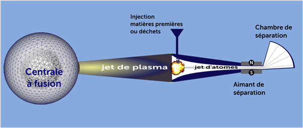 Demain, grâce à la fusion thermonucléaire, l’humanité pourra disposer d’un « haut fourneau nucléaire » : la « torche à plasma ». Il s’agit d’injecter dans le jet de plasma issu d’un réacteur à fusion, et donc à des températures dépassant les 100 millions de degrés, des morceaux du produit à décomposer (déchets, minerais, etc.), qui se sublimeront instantanément pour se mélanger au plasma.