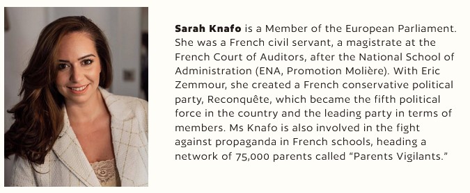 Sur le site de l’Institut Claremont, Knafo harbore le titre de titre de "Lincoln Fellow 2024". Son parti conservateur Reconquête est supposé le plus grand parti de France en termes de membres. Noté également, le fait qu’elle anime un réseau de 75000 parents intitulé "Parents vigilents" pour lutter contre la propagande dans les écoles françaises.