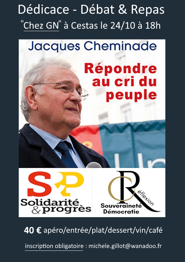 Après Metz le 4 octobre, Lyon le 18 octobre, Bordeaux le 24 octobre, la conférence de S&P/Institut Schiller de Paris le 8 et 9 novembre, le salon du Touquet-Paris-Plage le 15 novembre, Sète le 19 novembre ainsi que le vendredi 28 novembre la librairie Les Tropiques à Paris 56 et 63, rue Raymond Losserand, Paris XIVe (Affichette téléchargeable), voici les autres rdv à venir :