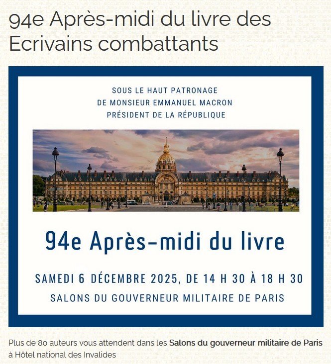 • samedi 6 décembre, de 14h30 à 18h30, 94e après-midi du livre, salons du gouverneur militaire de Paris, 129 rue de Grenelle, Paris VII.