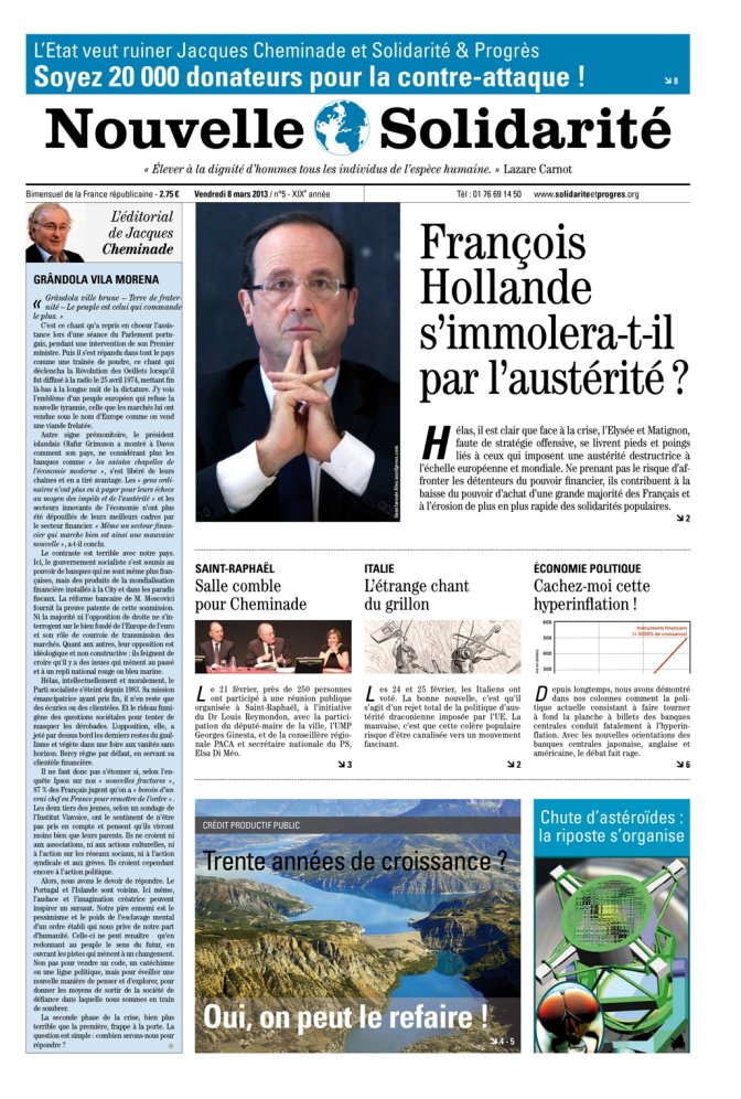 • FRANCOIS HOLLANDE S’IMMOLERA-T-IL PAR L’AUSTERITE ? Pour Jacques Cheminade, il est hélas « clair que face à la crise, l’Elysée et Matignon, faute de stratégie offensive, se livrent pieds et poings liés à ceux qui imposent une austérité destructrice à l’échelle européenne et mondiale. Ne prenant pas le risque d’affronter les détenteurs du pouvoir financier, ils contribuent à la baisse du pouvoir d’achat d’une grande majorité des Français et à l’érosion de plus en plus rapide des solidarités populaires » (p. 2).