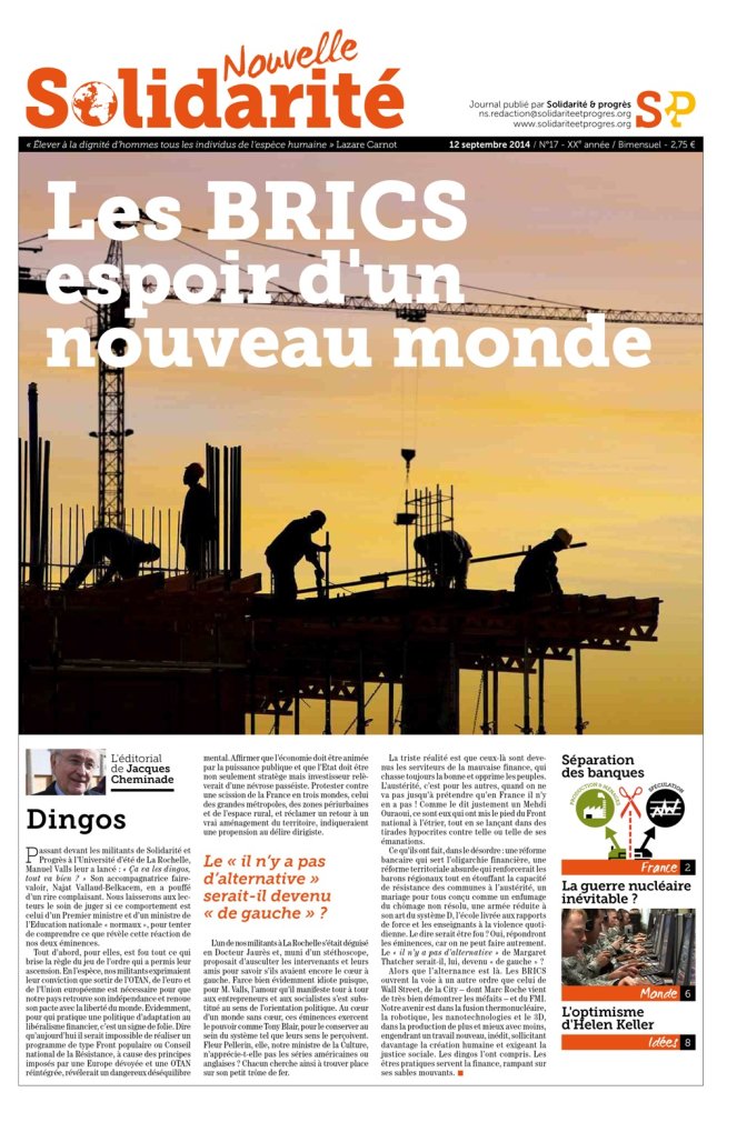• FOCUS : LES BRICS, première pierre d’un nouveau monde. Alors que la zone euro s’obstine à couper dans tous les budgets, la décision des pays des BRICS (Brésil, Russie, Inde, Chine et Afrique du Sud) de créer une Nouvelle banque de développement (NDB) au service de grand investissements dans les infrastructures, bouleverse l’ordre mondial. Pour vous permettre de saisir la substance de cette dynamique, et pas seulement sa forme, nous présentons ici, après les exemples de la Chine, de l’Égypte et de l’Argentine, ceux du Nicaragua, de l’Afrique du Sud et de l’Inde.