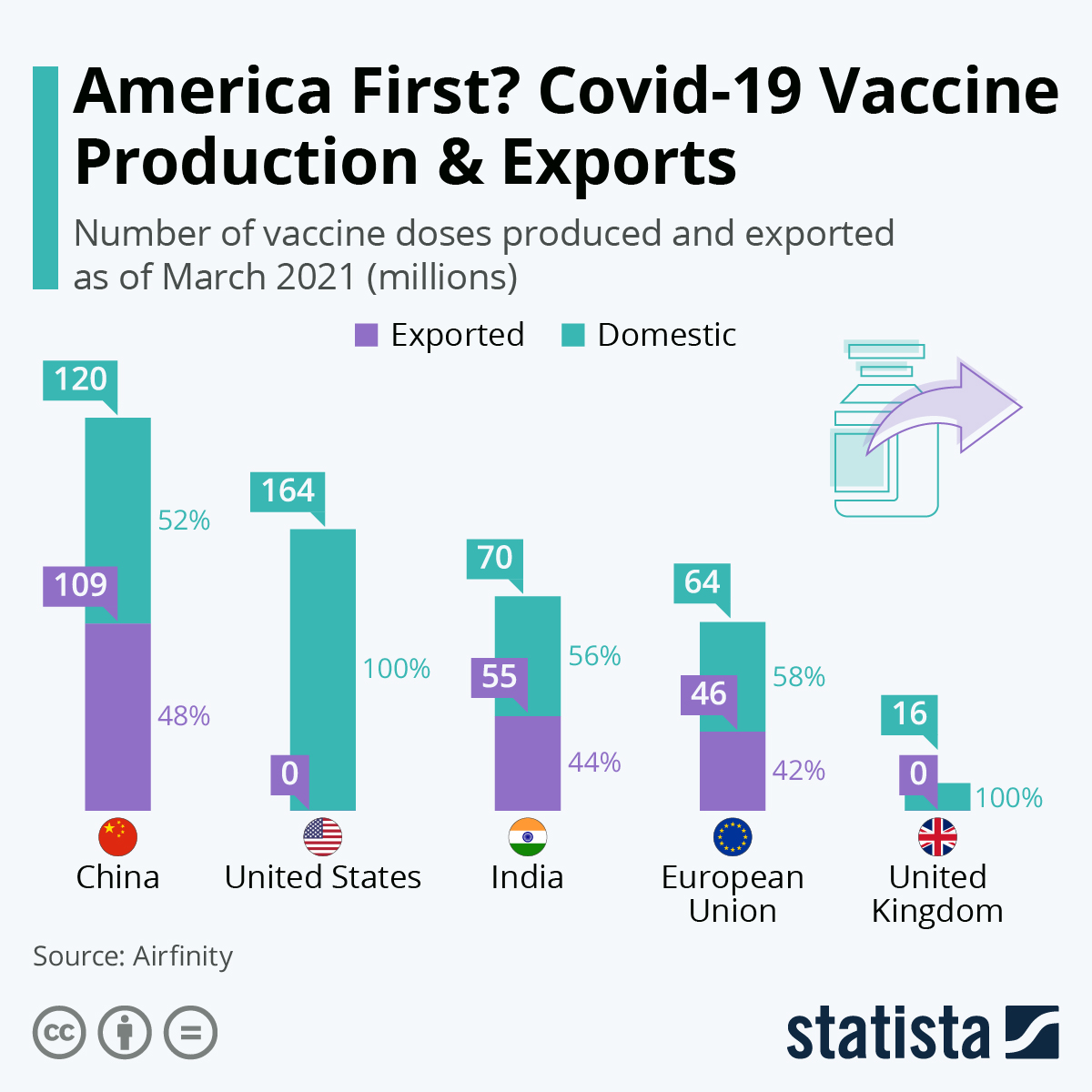 L’Union européenne a quant à elle produit 112 millions de doses, dont 42 % (46 millions) aurait été exporté, selon Airfinity. La présidente de la Commission européenne Ursula Van der Leyen, qui s’exprimait lors du dernier sommet du Conseil de l’UE, a affirmé que 77 millions de doses de vaccin auraient en réalité quitté le continent, en direction de 33 pays, dont la Chine, le Mexique, le Canada, les États-Unis et le Royaume-Uni. La Commission assure également être le principal donateur à Covax.
