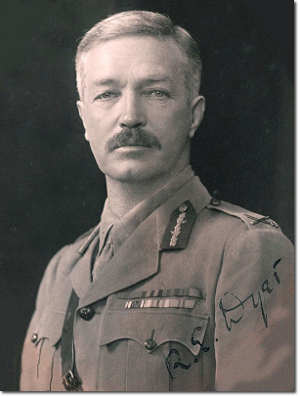 En 1919, les Britanniques répondirent brutalement à cela en commettant l’erreur stratégique du massacre du jardin Jallianwala Bagh à Amritsar dans le Pendjab. Le 13 avril, des centaines de civils hommes, femmes et enfants manifestaient pacifiquement à Amritsar pour protester contre le Rowlatt Act, la nouvelle loi qui permettait l’emprisonnement arbitraire de toute personne désignée comme « agitateur ». Cette manifestation se déroulait dans une cour entourée de murailles dans laquelle on ne pouvait entrer que par une seule porte. Pour provoquer un choc, le général Dyer (voir Image 10) décida de leur faire tirer dessus, non pas pour les disperser car cela était impossible, mais pour en tuer le plus grand nombre possible.