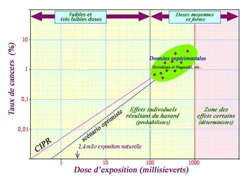 C’est ici qu’il est le plus difficile d’évaluer le risque encouru, notamment dans le domaine des faibles doses, en-dessous de 100 millisieverts, où il est même possible que l’effet soit bénéfique. En effet, certains scientifiques pensent que des exposition à des doses de moins de 100 mSv peuvent avoir un effet « protecteur » en cas d’expositions ultérieures à des doses plus élevées, et d’autres estiment que la vie ne pourrait même pas exister sans la présence de rayonnements ionisants de faible intensité.