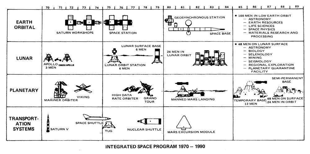 Ce Programme intégré 1970-1990 se fondait sur les principes de « ré-employabilité » et d’« interchangeabilité » des composants des diverses structures envoyées dans l’espace, comme on peut le voir dans les dessins fournis par von Braun lui-même.