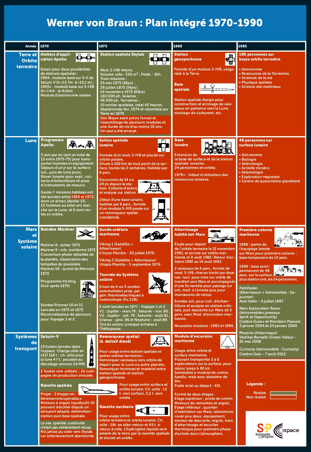 Von Braun divise les étapes du programme en quatre périodes de cinq ans, afin de couvrir les années 70 et 80, c’est-à-dire une génération. Ce seul fait illustre la rapidité des avancées scientifiques envisagées par von Braun, en réalité une véritable révolution dans l’histoire de l’humanité, aussi importante que la révolution du néolitique et la révolution industrielle du XIXe siècle.