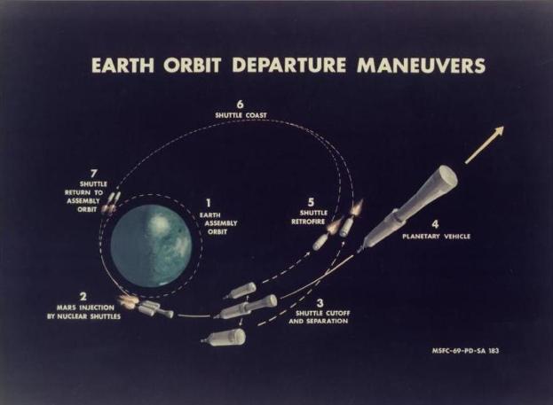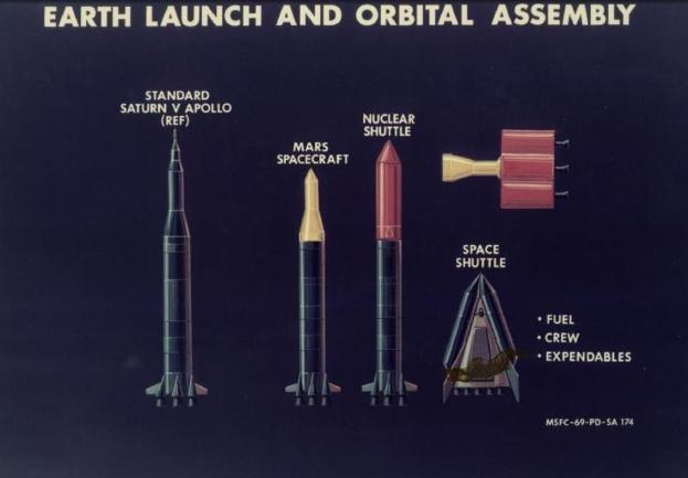 En même temps, il fallait développer un remorqueur spatial à forte capacité d’accélération pour tracter les vaisseaux depuis l’orbite basse terrestre vers le point de départ pour la Lune, ainsi que pour l’aller-retour entre l’orbite basse et la surface lunaire. Un autre véhicule devait être développé à peu près en même temps, une navette nucléaire pouvant remorquer des vaisseaux plus lourds destinés à transporter des charges entre la Terre et la Lune ou à voyager vers Mars. Ces navettes nucléaires devaient être utilisées uniquement dans l’espace, dans des environnements de faible gravité.