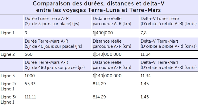 Si le nombre total de « coups d’accélérateurs » nécessaires pour faire le voyage de la Terre à la Lune ne diffère pas beaucoup de celui qu’il faut pour se rendre de la Terre jusqu’à Mars (le premier est de 3,9 km/s et le second 5,67 km/s, ce qui fait respectivement 7,8 km/s et 11,34 km/s en aller-retour, ou un rapport de 1,45 entre les deux), la différence entre les distances réelles parcourues est cependant beaucoup plus grande. La distance Terre-Mars fait 814,29 fois la distance Terre-Lune ! (Voir tableau.)