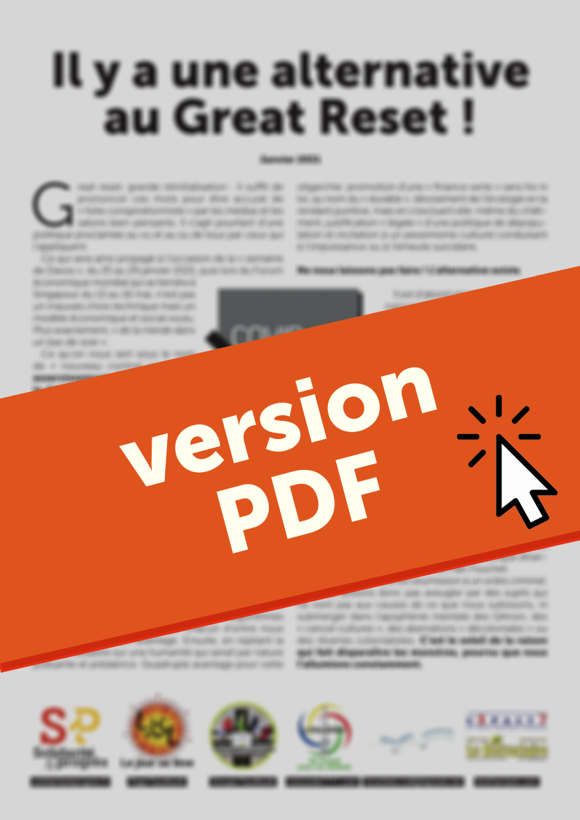 Pour mobiliser un maximum de personnes, les militants S&P, mais aussi des membres de différents collectifs [1], ainsi que des citoyens « sans étiquette », distribueront sur l’ensemble du territoire le tract « Il y a une alternative au Great Reset ».