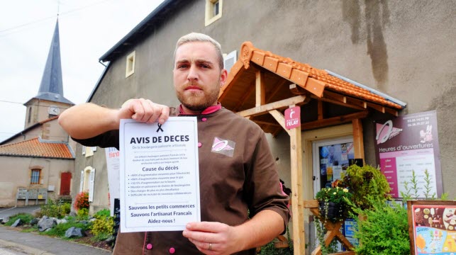 Pris à la gorge, nos artisans-boulangers affichent des avis de décès sur leurs vitrines détaillant la « longue agonie » de la boulangerie-pâtisserie artisanale et les causes de sa mort imminente :