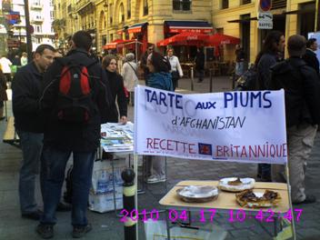La semaine dernière, les militants S&P parisiens, sont venus en aide à nos 3700 soldats déployés dans le « merdier » afghan [*]. Tant à l’école militaire que devant le ministère de la défense, gradés comme simple passants ont pu goûter aux délicieuses « tartes opiums » vendues par nos militants.