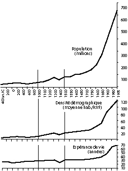 Nous constatons que ces trois courbes augmentent ... simultanément depuis la Renaissance ! Nous nous attendrions normalement à ce que la densité démographique s’accroisse au dépend de l’espérance ou de la qualité de vie, mais nous sommes fort heureusement obligés d’admettre que ce n’est généralement pas le cas, malgré les conséquences parfois fâcheuses des bêtises commises par certains hommes politiques ou des errements de l’opinion publique.