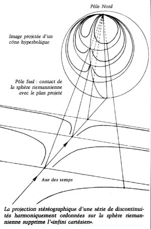 Cette représentation, développée par Jonathan Tennenbaum, nous permet de montrer la nature relative des discontinuités,qui peuvent être « facilement » transcendées lorsque nous changeons de point de vue. Ainsi, du point de vue de la « sphère riemannienne » sur laquelle sont projetés les hypercônes, les discontinuités apparemment infranchissable dans le plan disparaissent, car les extrémités des hypercônes se joignent en un seul point, situé sur le pôle de la sphère. Pour ce qui concerne l’univers physique dans lequel nous vivons, les découvertes de principes nouveaux ne sont évidemment pas aussi facile à faire. Cela dépend entre autres de la qualité de l’éducation, tant scientifique qu’artistique.
