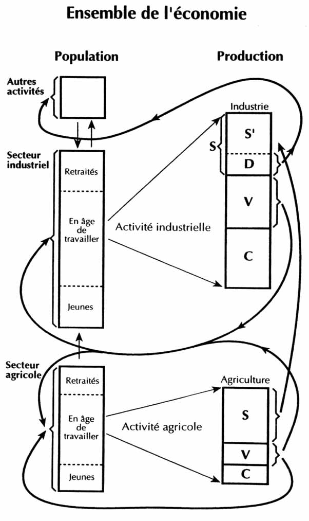 Ce problème est directement relié à celui qui a été soulevé par Marx dans le troisième volume de son Capital, et qu’il a exprimé sous la forme de la loi sur la diminution du taux de rendement. Soit T, la Production totale. Comment devons-nous réallouer les heures de travail pour perpétuer le cycle de production ?
