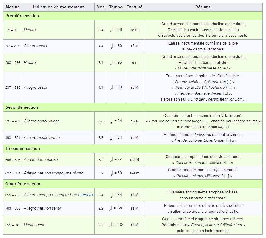 « Ô, amis, pas ces sons... mais accordons-nous sur une musique plus agréable et joyeuse. » Ainsi se trouvent confirmées ce que laissaient deviner le indications notées par Beethoven dans ses carnets d’esquisse : aucun des thèmes de « l’ancien monde » (les trois premiers mouvements) ne peut porter l’Ode à la joie. Seul un nouveau monde musical est en mesure de signifier le poème de Schiller. Et c’est, symboliquement, Beethoven en personne qui parle ici, dans ces quelques paroles écrites et ajoutées de sa main puis chantées exactement à l’identique des récitatifs de la section précédente.