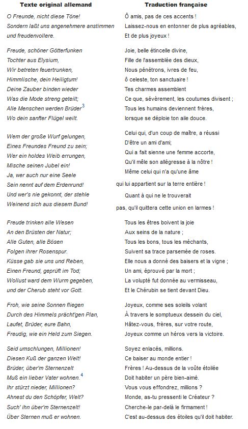 Enfin, en 1822, le thème apparaît sous sa forme finale avec les paroles de l’Ode à la joie, dans un cahier d’esquisses de Beethoven. Au regard d’aujourd’hui, cette longue gestation pour trouver ce thème si « simple et si populaire qu’il semble avoir existé de tout temps », peut sembler incompréhensible mais il fallait que dans ses « gènes » musicaux soient inscrits les idéaux exprimés par le poème de Schiller : la joie, mais sans banalité ; la fraternité, sans sentimentalisme ; la recherche du bonheur, sans démagogie, comme dénominateurs communs de l’humanité.