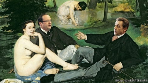 Exhibant un pastiche du tableau de Manet, Le déjeuner sur l’herbe, montrant un Sarkozy et un Hollande décontractés en compagnie d’une belle dénudée, l’article affirme avec force qu’aucun candidat à l’élection présidentielle française n’a le courage d’annoncer directement aux Français le destin fatal qui les attend : une réduction brutale de leur niveau de vie et la fin de tous les acquis sociaux obtenus depuis 1945.