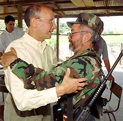 | Grasso abrazo entre Richard Grasso, président du New York Stock Exchange et le commandant Raul Reyes, trésorier du FARC, le 26 juin 1999 |