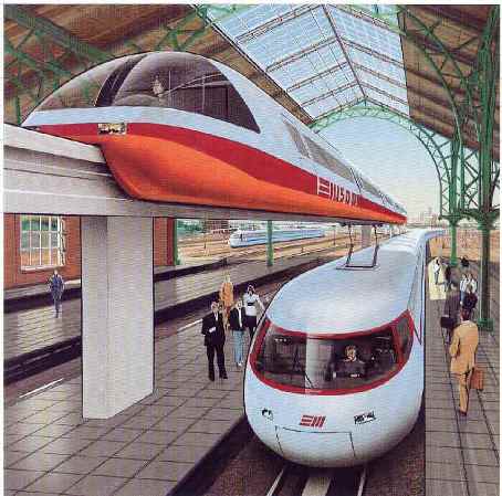 - (1a) En améliorant les rails et les roues métalliques et en équipant le matériel roulant de moteurs électriques linéaires, on peut accélérer la vitesse des trains : des moteurs plus performants font tourner des roues plus performantes sur des rails plus performants. C’est le modèle du TGV français et de l’ICE allemand.