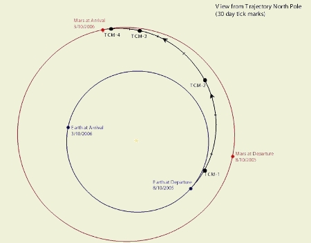 Ici, nous voyons les positions de la Terre (orbite bleue) et de Mars (orbite rouge) lors du lancement le 10 août 2005, puis leurs positions lors de l’arrivée du satellite autour de Mars le 10 mars 2006.