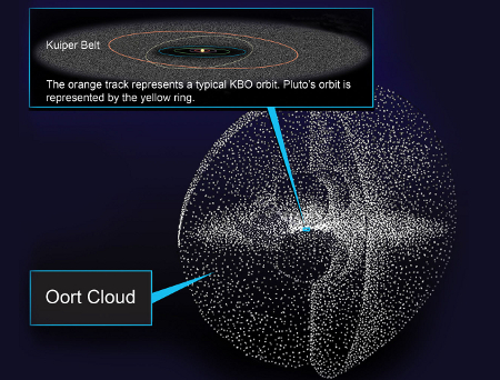 La théorie affirme qu’il en existerait des milliers de milliards, formant ce nuage situé aux confins du système solaire. Comme nous verrons par la suite, ceci nous amène à des considérations de nature galactique, car nous sommes ici à la frontière entre notre système solaire et la galaxie dans laquelle nous nous déplaçons.