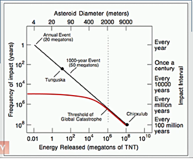 La ligne rouge représente une estimation du pourcentage de ceux que nous croyons avoir découverts selon les différentes tailles d’objets. Ainsi, nous pensons avoir découvert, en bas à droite, la plupart des objets de grande taille (plus de 90 % d’entre eux) car ils sont plus faciles à détecter. Mais lorsqu’ils deviennent de plus en plus petits, il y en a de plus en plus. Nous n’avons presque pas répertorié les plus petits. Ces derniers ne sont toutefois pas sans danger. L’astéroïde de Tunguska (qui est tombé en Sibérie en 1908 et a rasé une vaste zone) avait un diamètre de seulement 30 à 50 mètres. Un objet comme celui-ci pourrait rayer de la carte une région métropolitaine majeure, comme la Baie de San Francisco par exemple.