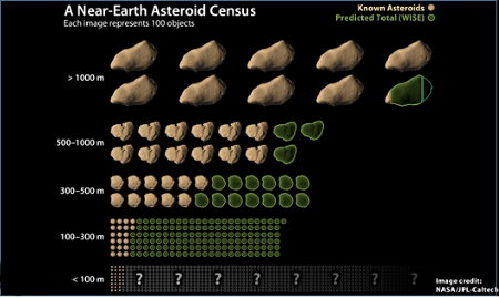 Ceci (figure 5) est le résultat d’une étude récente, montrant les astéroïdes selon leur taille et le pourcentage que la NASA estime avoir découvert, les parties vertes représentant ceux que nous n’avons pas trouvés.