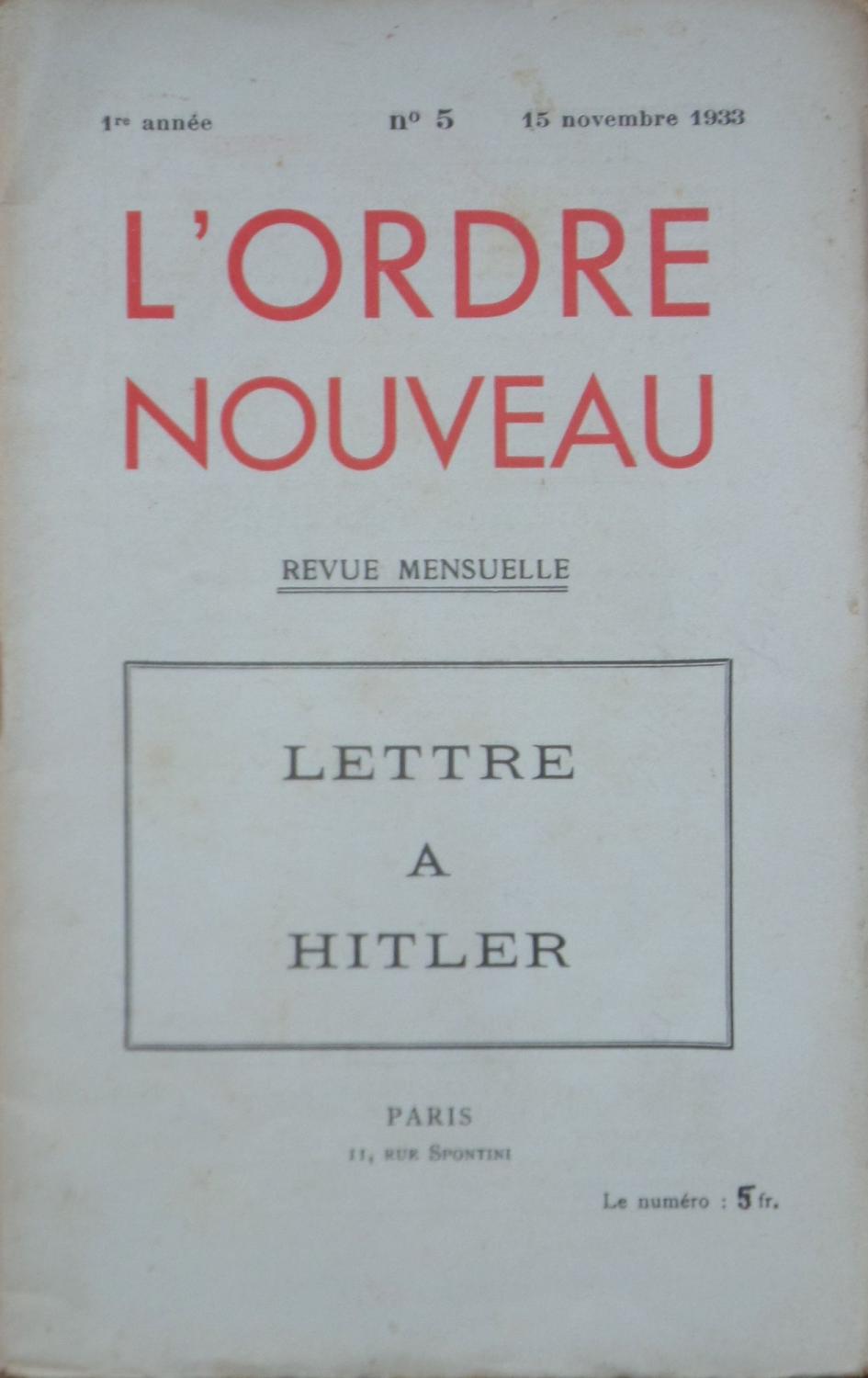 La Lettre à Hitler, publiée par un collectif de six personnes, dont de Rougemont, dans la revue Ordre Nouveau de novembre 1933, ne manque pas d’ambiguïté. Le texte se réjouit d’abord de la lucidité du national-socialisme, qui aurait pris acte « de l’erreur industrialiste commune aux capitalistes d’Occident et aux communistes d’URSS », de l’hypocrisie de la démocratie libérale, du matérialisme et des méfaits du « productivisme ».