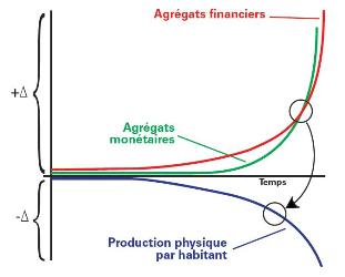 Comme le niveau de l’économie physique de la nation (production et distribution de biens physiques, infrastructure) a été subordonné, depuis quarante ans, à des valeurs de plus en plus temporaires et fictives d’instruments financiers et monétaires, leurs taux de croissance relatifs ont de plus en plus divergé.