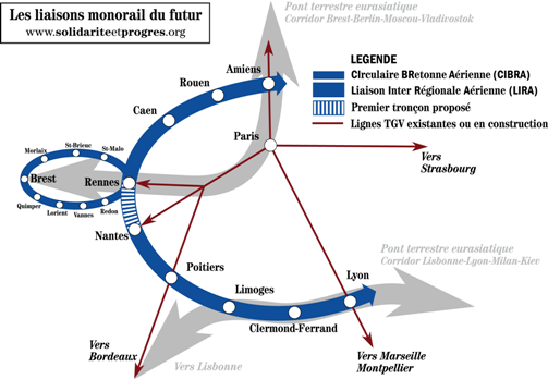 Tout projet audacieux d’infrastructure nouvelle, à part répondre aux besoins immédiats des populations, cherche à orienter et à rendre possible un futur qui pour l’instant n’est que potentiel. C’est à cette double exigence, celui d’un futur agissant dans un présent qu’il faut améliorer tout de suite, qu’obéit notre projet de « double boucle », articulant la création d’une Liaison interrégionale rapide aérienne (LIRA) reliant Rennes à Nantes, avec une voie circulaire bretonne aérienne (CIBRA) reliant plus de 90 % de la population urbaine de la Bretagne par des liaisons monorail aérotrain ultrarapides (voir fiche aérotrain « nouvelle génération »). Les tracés que nous proposons ici au nom de l’aménagement du territoire (régional et province-province), ne visent nullement à se substituer aux axes de TGV (capital-province), mais les complètent harmonieusement.