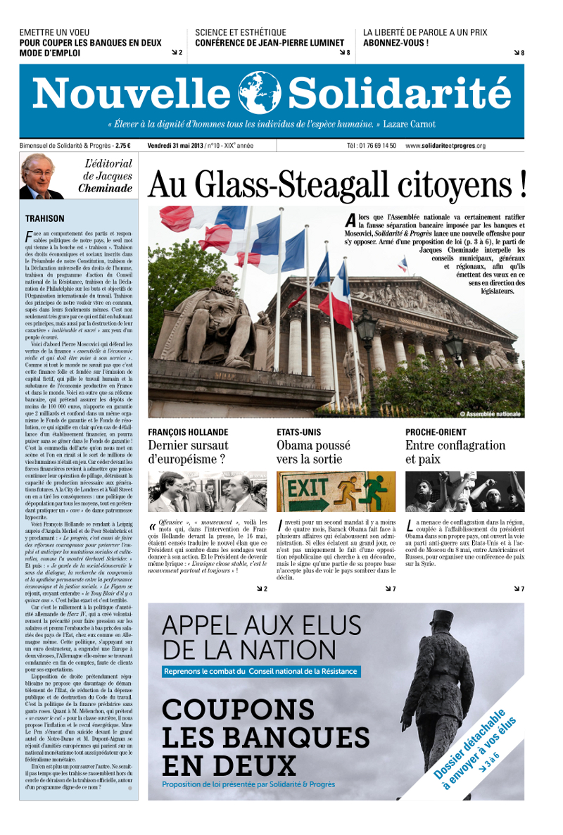 Le 1 février 2017, lors d’une conférence de presse dans la capitale, quatre députés américains ont annoncé qu’ils venaient d’introduire une proposition de loi visant le rétablissement du Glass-Steagall Act, une loi imposée par Franklin Roosevelt en 1933 séparant de façon stricte les banques ordinaires (épargne, dépôts, crédits, etc.) des banques d’affaires (marchés, spéculation) adoptée en France dans l’après-guerre. Aux Etats-Unis, la loi fut abrogée en 1999.