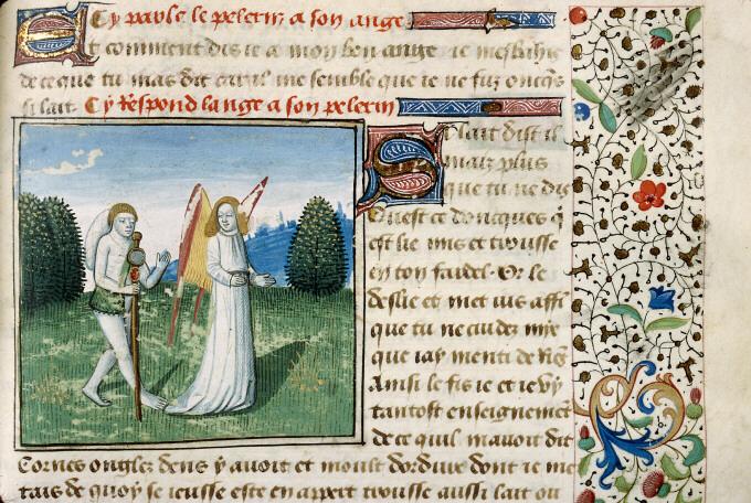 Ce thème de l’homo viator, l’homme qui se détache des biens terrestres, est par ailleurs récurrent dans l’art et la littérature de cette époque, en particulier depuis la traduction en néerlandais du Pèlerinage de la vie et de l’âme humaine, écrit en 1358 par le moine cistercien normand Guillaume de Degulleville (1295-après 1358). Une miniature de cette œuvre nous montre une âme sur son chemin, habillée en colporteur.