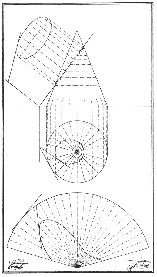 C’est ainsi qu’il fit la synthèse d’un nouveau concept en mettant à jour le principe commun sous-jacent à toutes les techniques graphiques et à tous les problèmes liés à l’espace, et qu’il découvrit qu’en posant sous une forme géométrique les différents problèmes posés par les différentes techniques, une similarité allait apparaître qui permettrait de résoudre ces problèmes à l’aide de la méthode des deux projections orthogonales [8].