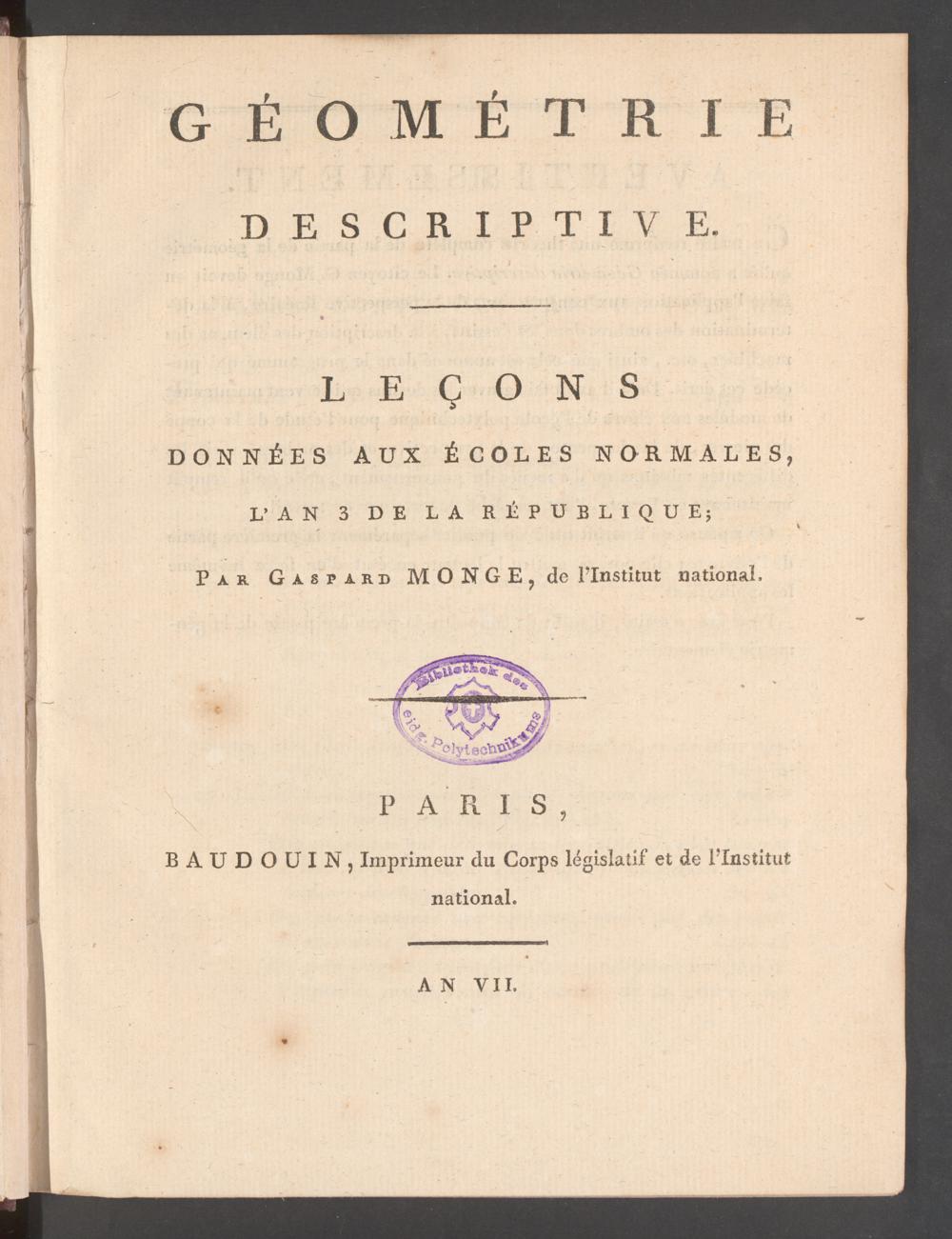 C’était aussi, après la brève expérience de l’Ecole normale de l’année précédente, la première fois que Monge enseignait en public sa géométrie descriptive (qui avait été frappée au sceau du secret militaire à Mézières pendant de longues années auparavant), recherchant toujours les meilleurs résultats pédagogiques, recourant à des manuscrits en sa possession pour remédier au manque de manuels, utilisant des modèles de bois ou de pierre, des heurismes graphiques, etc.