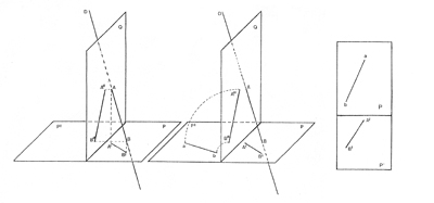 Il suffit de rabattre le plan Q sur le plan P’, prolongement du plan P, et de reporter alors les points A" et B" sur le plan P’, ce qui nous donne les points indiqués a et b. La représentation finale du segment AB est indiquée ci-dessous.