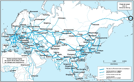 - En Eurasie, la voie ferrée en Sibérie orientale et le pont et/ou tunnel du détroit de Béring ;