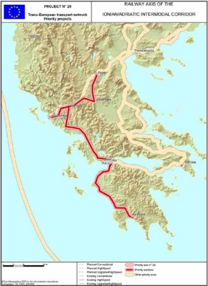 Le Plan pan-européen (corridor 7 décrit ci-dessus) trace les routes prioritaires pour des chemins de fer modernes, reliant cette région à l’Eurasie (figure 4). Sur la côte grecque de l’Adriatique se trouve le port de Igoumenitsa, l’un des plus importants de la région, avec plus de 200 000 passagers et 120 000 camions par an au cours des années récentes, et une importante liaison par ferry entre la Grèce, les îles grecques et l’Italie. Un projet est en cours pour développer plus avant une liaison entre les ports de Taranto, le deuxième plus grand port d’Italie et d’Igoumenitsa, puis vers l’autoroute Egnatia Odos traversant le nord de la Grèce, pour rejoindre les ports de Thessalonique, Kavala et Alexandropoulis, et ensuite Istanbul.